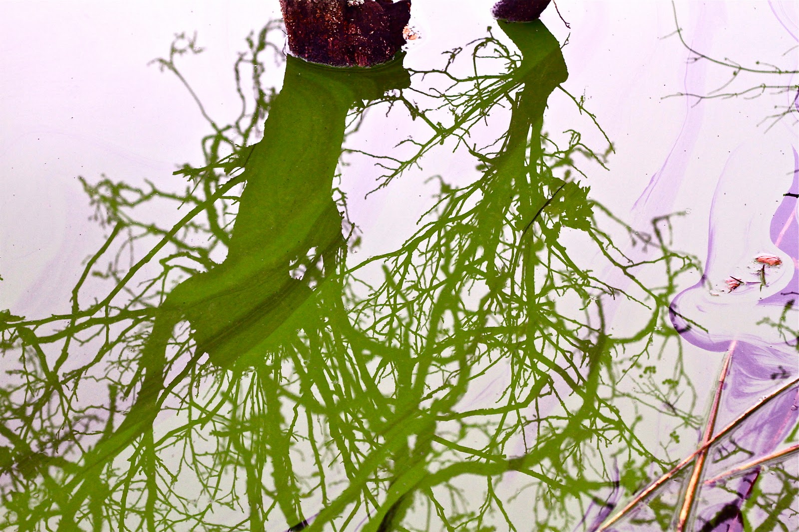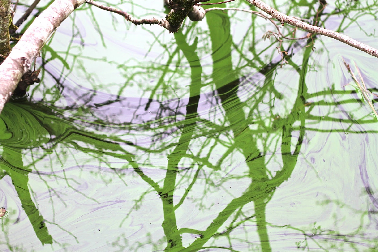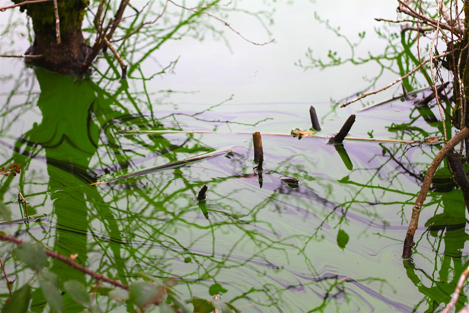 A deep green rim of algae has appeared at the edge of the lake. On a grey afternoon this created the most enchanting dark mirror for the lakeside trees. Impossible to focus because of glare and the odd stray branch, I had to wait until these were uploaded to see the full extent of the images.